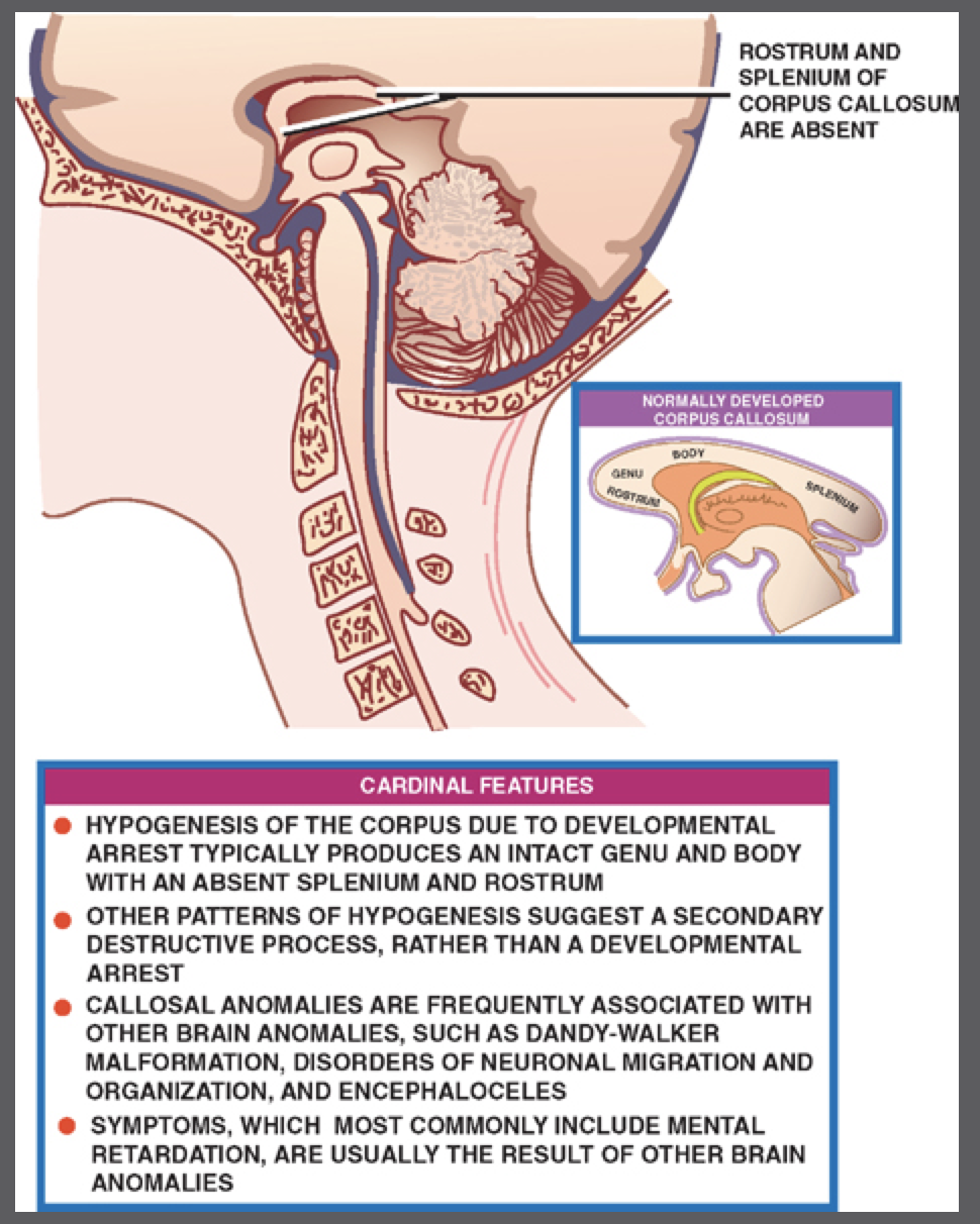 Due to front to back development, then developmental arrest will normally result in an intact genu with a partially or completely formed body and small or absent splenium or rostrum.