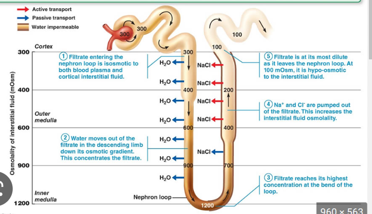 2) Descending loop descends from cortex into medulla the concentration of salts in interstitium increases