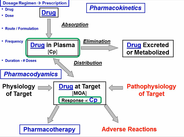 The process of getting the drug to the target and keeping it at the target. Includes the factors of absorption, elimination, and distribution of the drug.