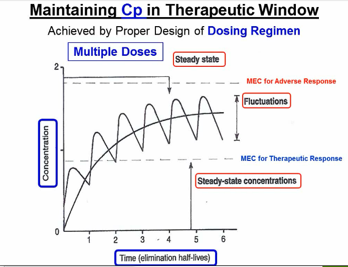The therapeutic window. A wide window allows for greater variation in Cp level, and a narrow window limits the acceptable variation. Peak size may be modified by the formulation of the drug. A slow release formula may allow for gradual release of the drug over may hours time, narrowing the range in Cp level and decreasing the dose frequency.