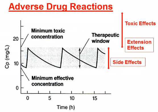Side Effects and Extension Effects. Side effects occur when the drug acts on a non-target system, but at normal therapeutic doses. Extension effects occur when the drug acts at the target system in too large an effect (supra-therapeutic dose).