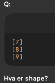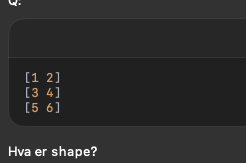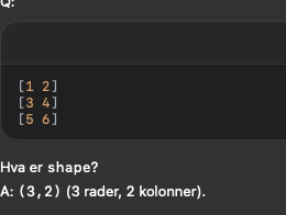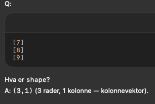 Eksempel: Hvis X har shape (3,2) og w har shape (2,), hva blir resultatet av X @ w?