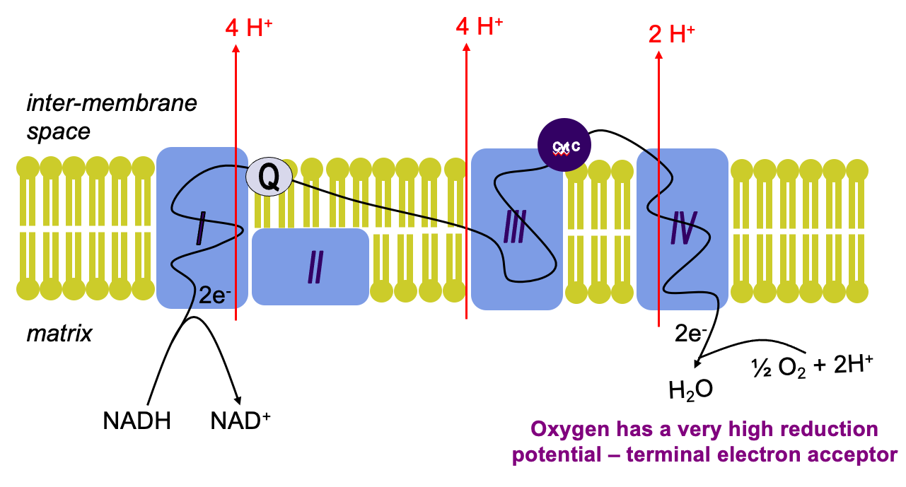 NADH → Complex I → Coenzyme Q (Ubiquinone) → Complex III → Cytochrome c → Complex IV → Oxygen (O2)