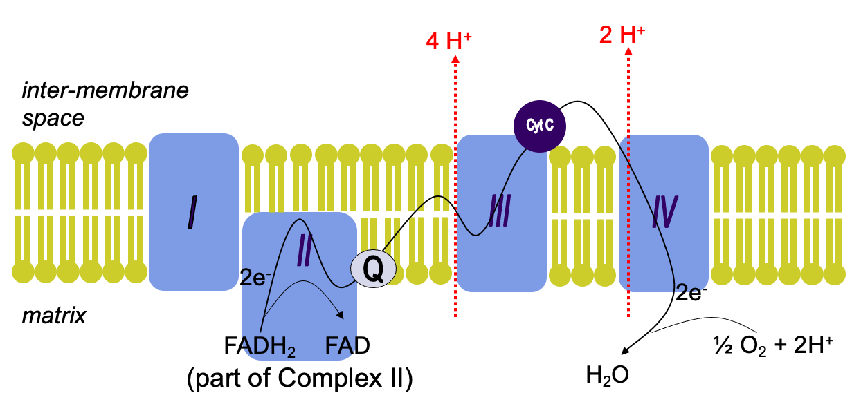 FADH2 → Coenzyme Q (Ubiquinone) → Complex III → Cytochrome c → Complex IV → Oxygen (O2)