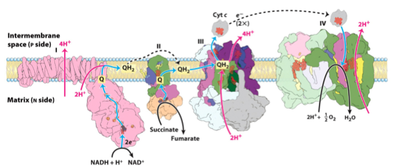 oxidative phosphorylation contains 4 enzyme complexes along the inner membrane that function in electron transport. what are the enzymes of each complex?