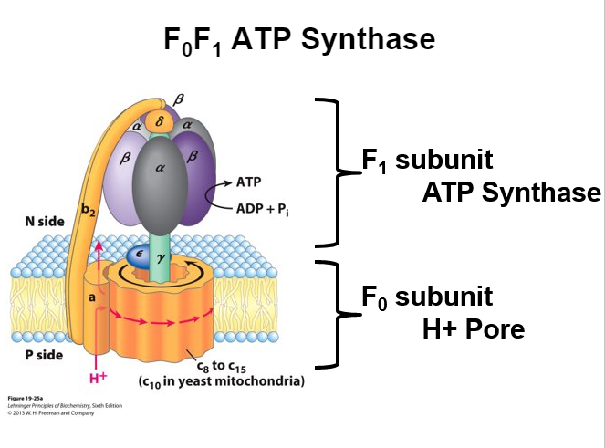Protons move through the F0 subunit –> movement causes F0 subunit to rotate –> results in conformational change of beta subunits in F1 subunit that results in formation of ATP