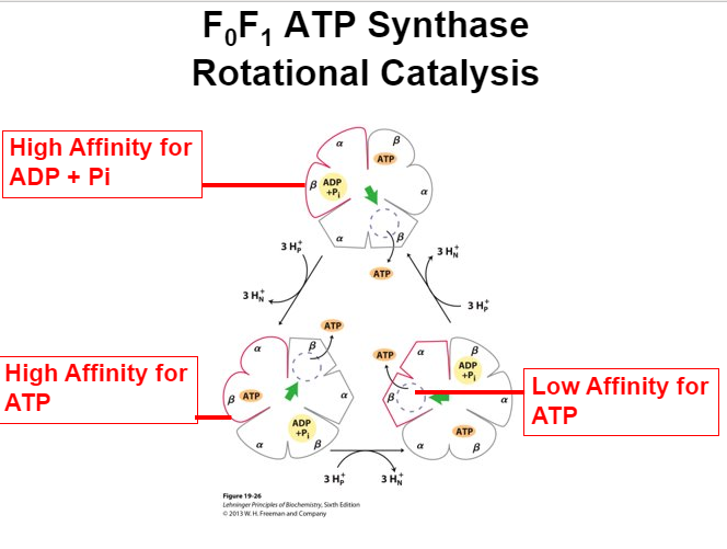 Each subunit pair (alpha and beta) of F1 subunit has different affinity for different compounds. At beginning of rotation, high affinity binding for ADP + Pi is open so these molecules flood in and bind. Subunit rotates, now high affinity ATP site is exposed, nothing happens. Rotates, now low affinity ATP is exposed –> releases newly made ATP to cytosol of mitochondria.