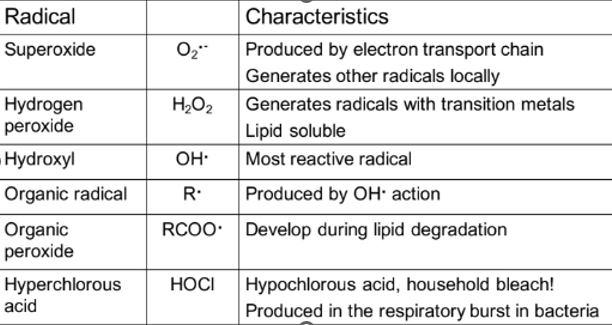 Highly reactive oxygen containing compounds Free radicals- single unpaired electron in orbital