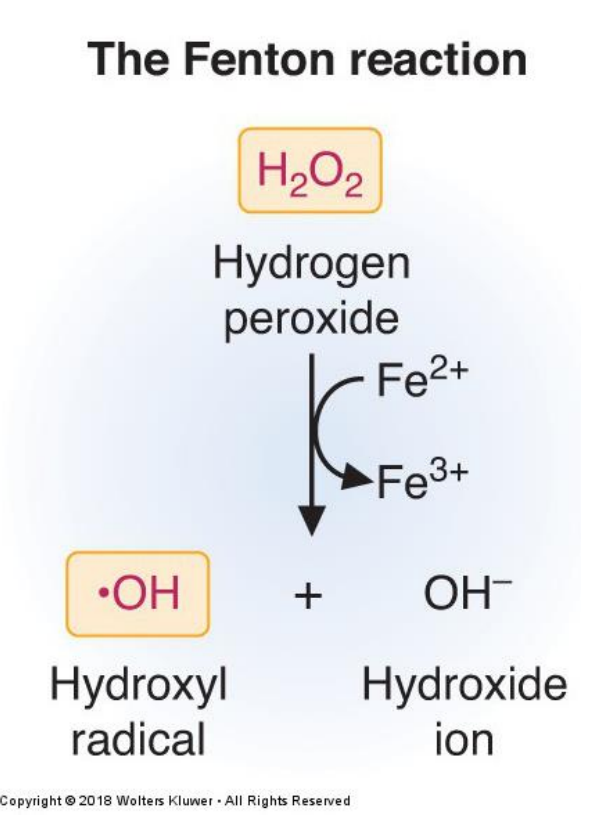 The reaction of hydrogen peroxide with a transition metal to form a hydroxyl radical