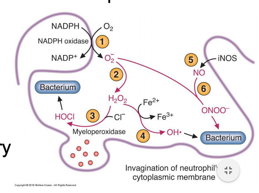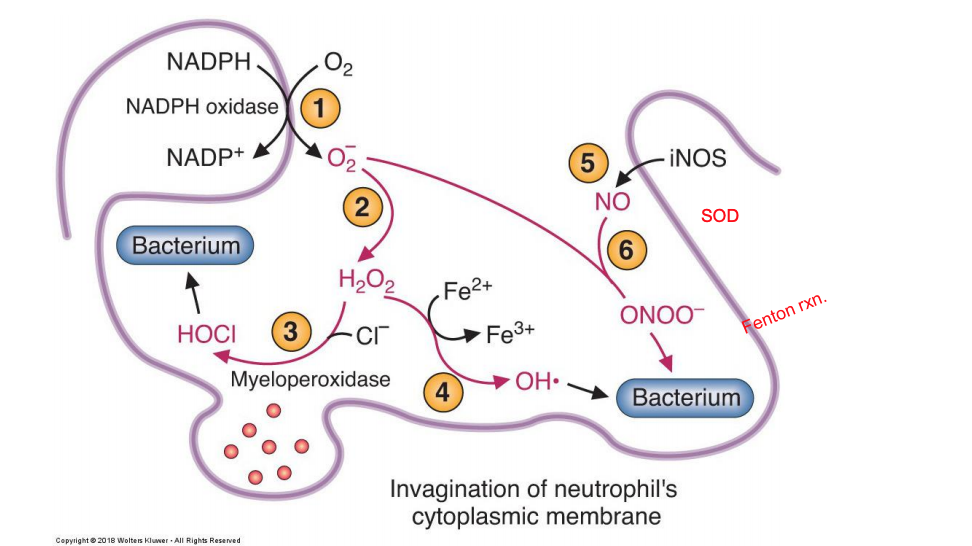NADPH odidase produces superoxide, which then combines with NO to produce RNOS (perody nitrate)
