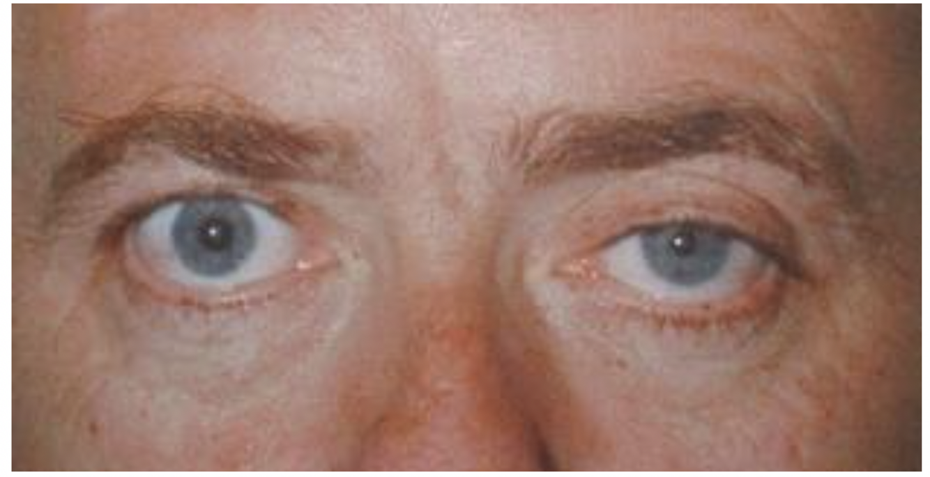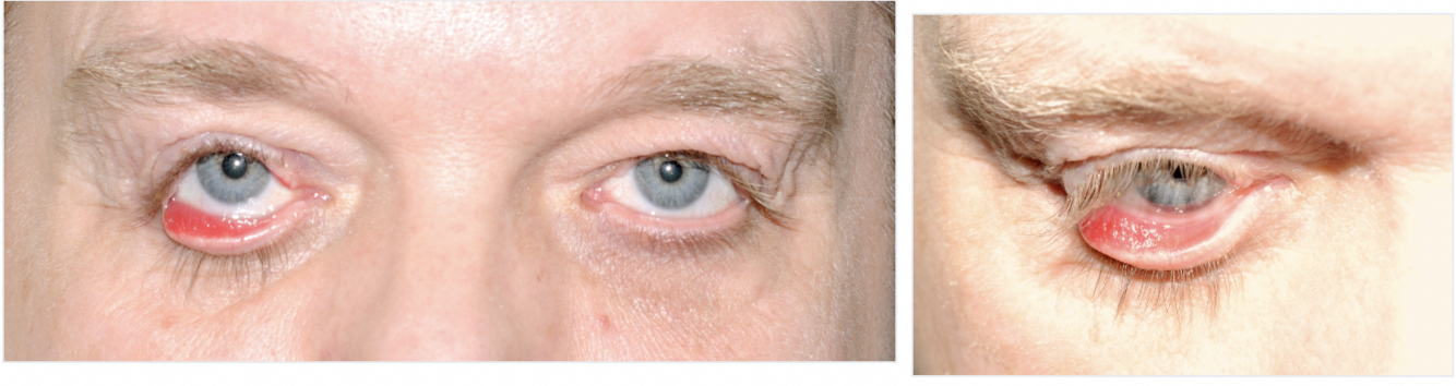 - Nedre (eller øvre) øyelokk henger ned og ut.