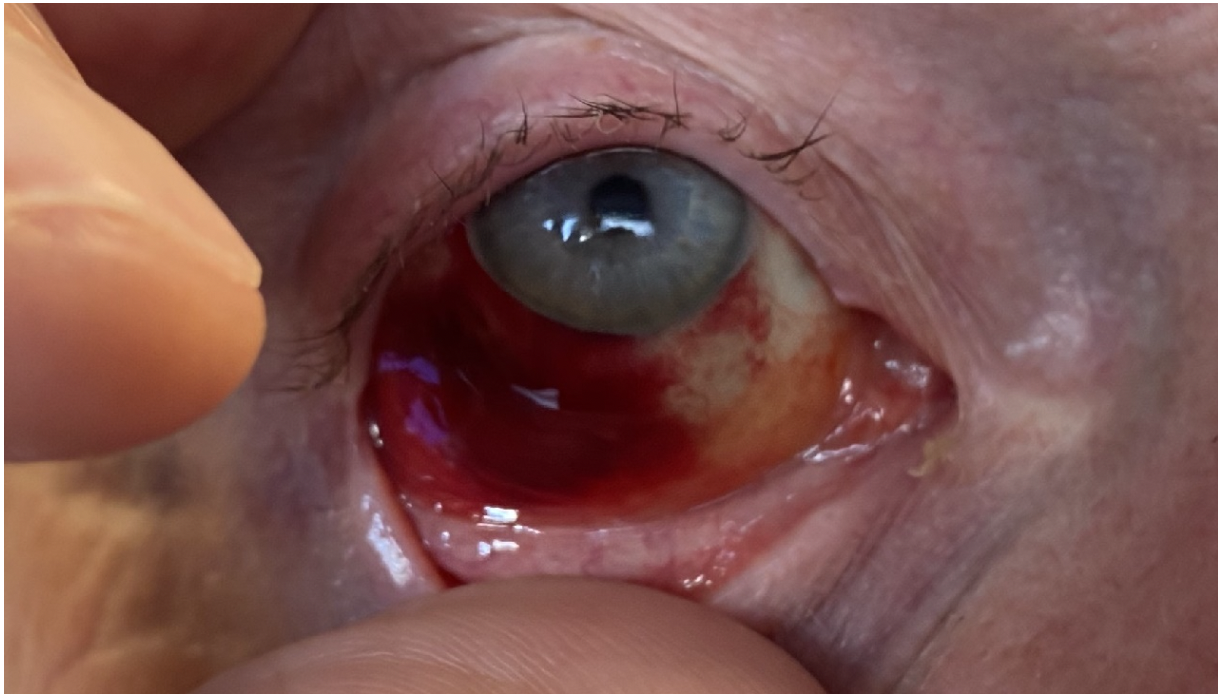 Hypopyon = ansamling av puss (hvite blodceller) i forkammeret.