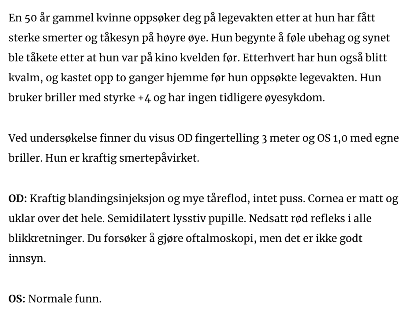 Akutt trangvinkel glaukom: ensidig blandinginjisert øye, midtdilatert lysstiv pupille, uklar kornea, redusert syn og sterke smerter