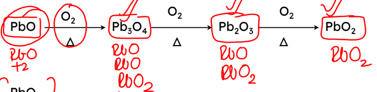 PbO heated with O2 forms ___ ;then that heated with oxygen____ forms; and then heated that with oxygen forms