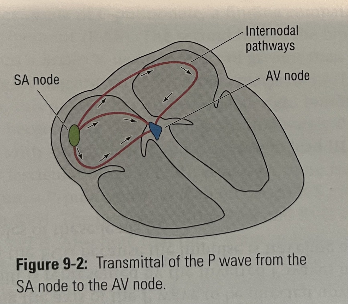 Impulse originates from the SA node and then travels through fast conduction pathways (similar to Purkinjie fibers) via the anterior, middle and posterior internodal pathways. The Bachmann bundle is an internodal pathway connecting the two atria. This causes synchronized innervation of the atrial mycocytes and then impulse then finally reaches the AV node.