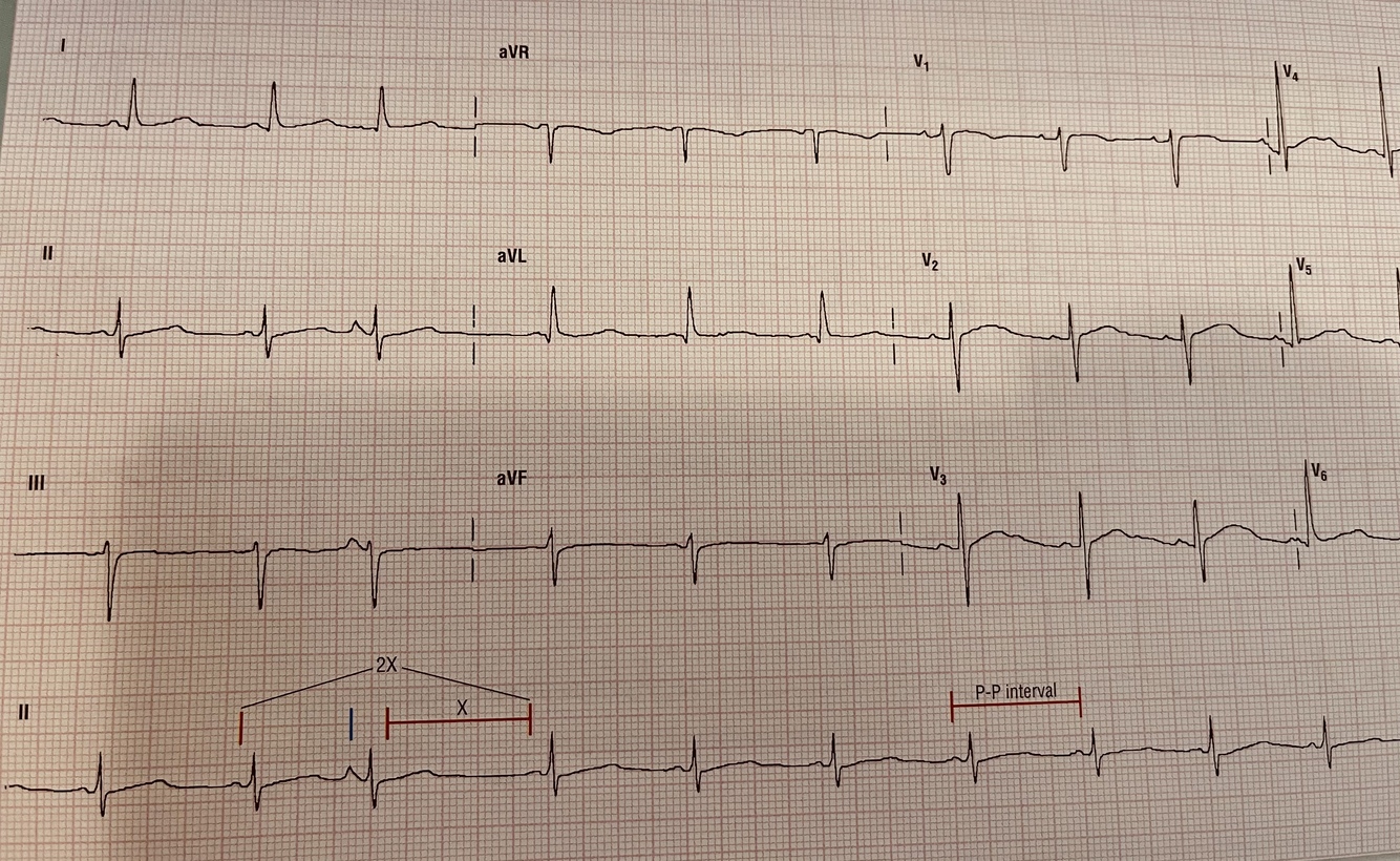 We can measure the normal P-P interval by placing calipers on tips of the p-wave and then for a PAC we will notice that the P-wave occurs before the regular P-P interval. If the sinus node was not reset then the next normal p-wave will occur at 2X (P-P) and this would be a compensatory pause keeping the next beats in sync. However, if the sinus node was reset then the next normal sinus beat with be before 2X.