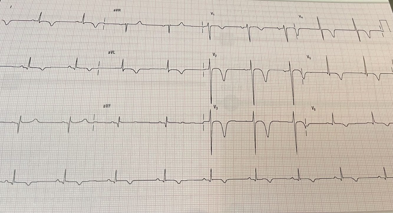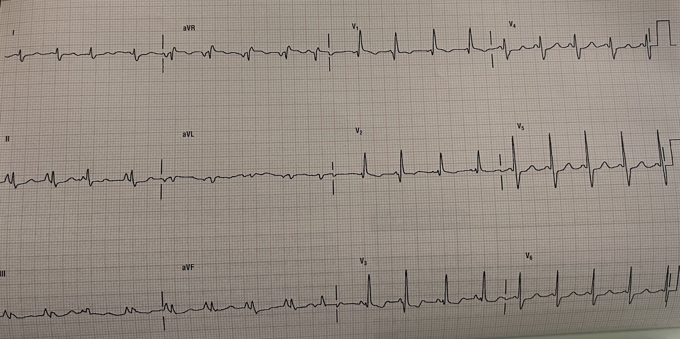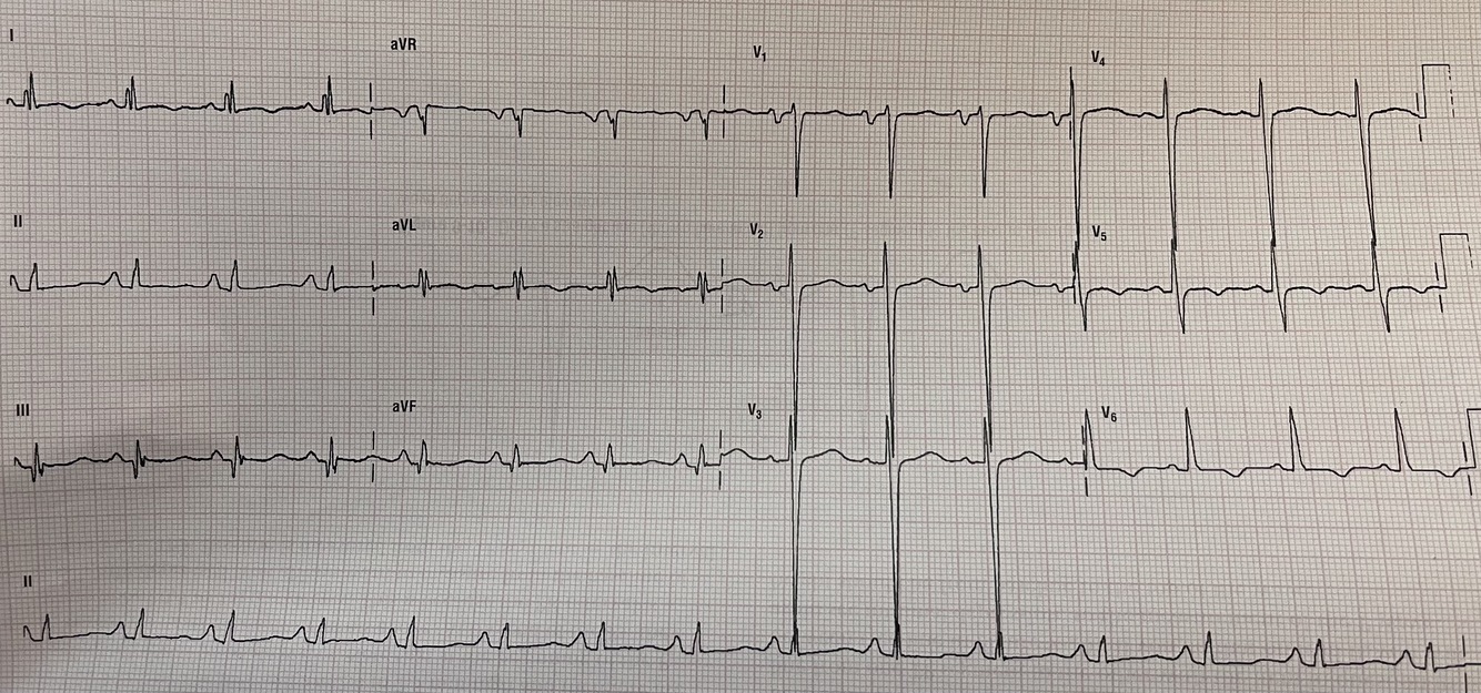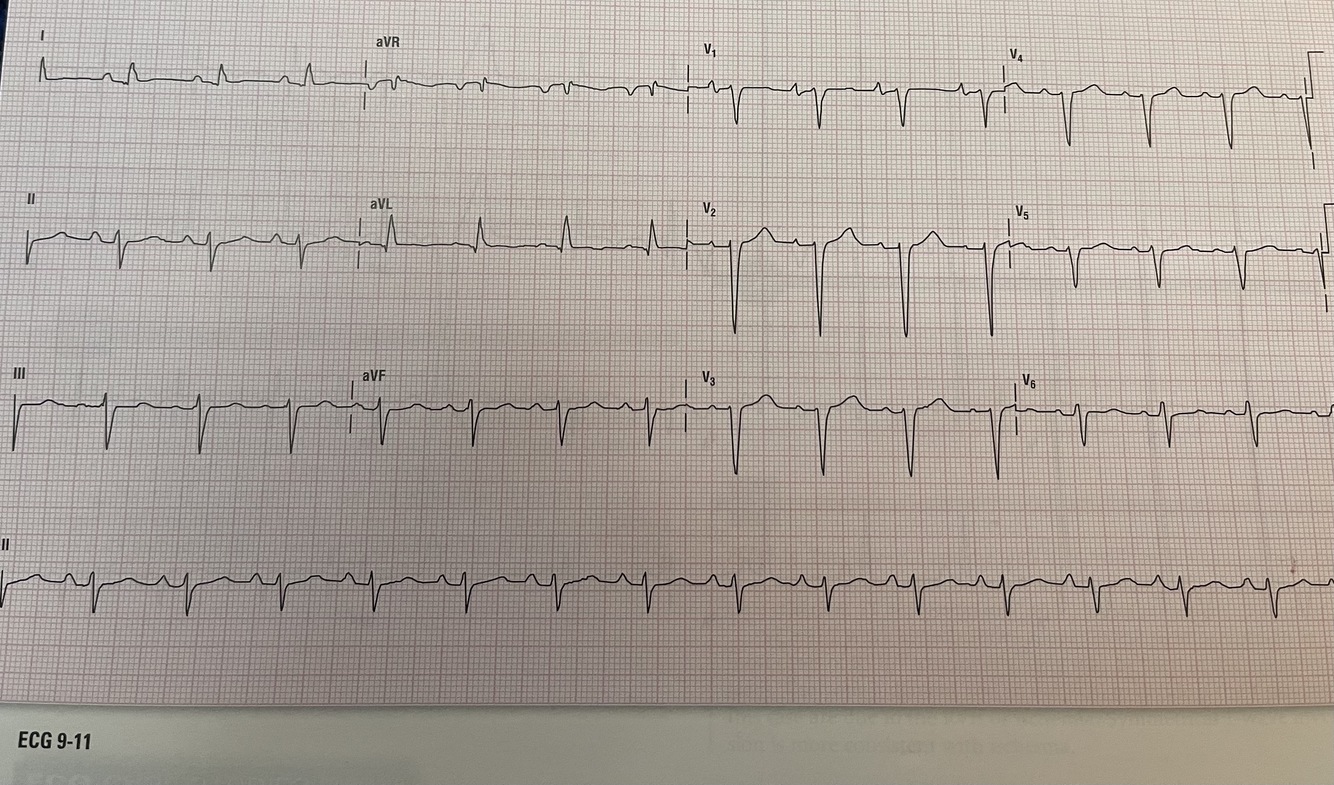 In this EKG we see P-mitrale in leads II and III indicative of LAE. We also see deep S waves in V1-V2 with ST-elevations which could be due to LVH. However, we don’t see increased voltages in lateral leads and this could be due to a prior infarct, left sided pleural effusion or obesity.