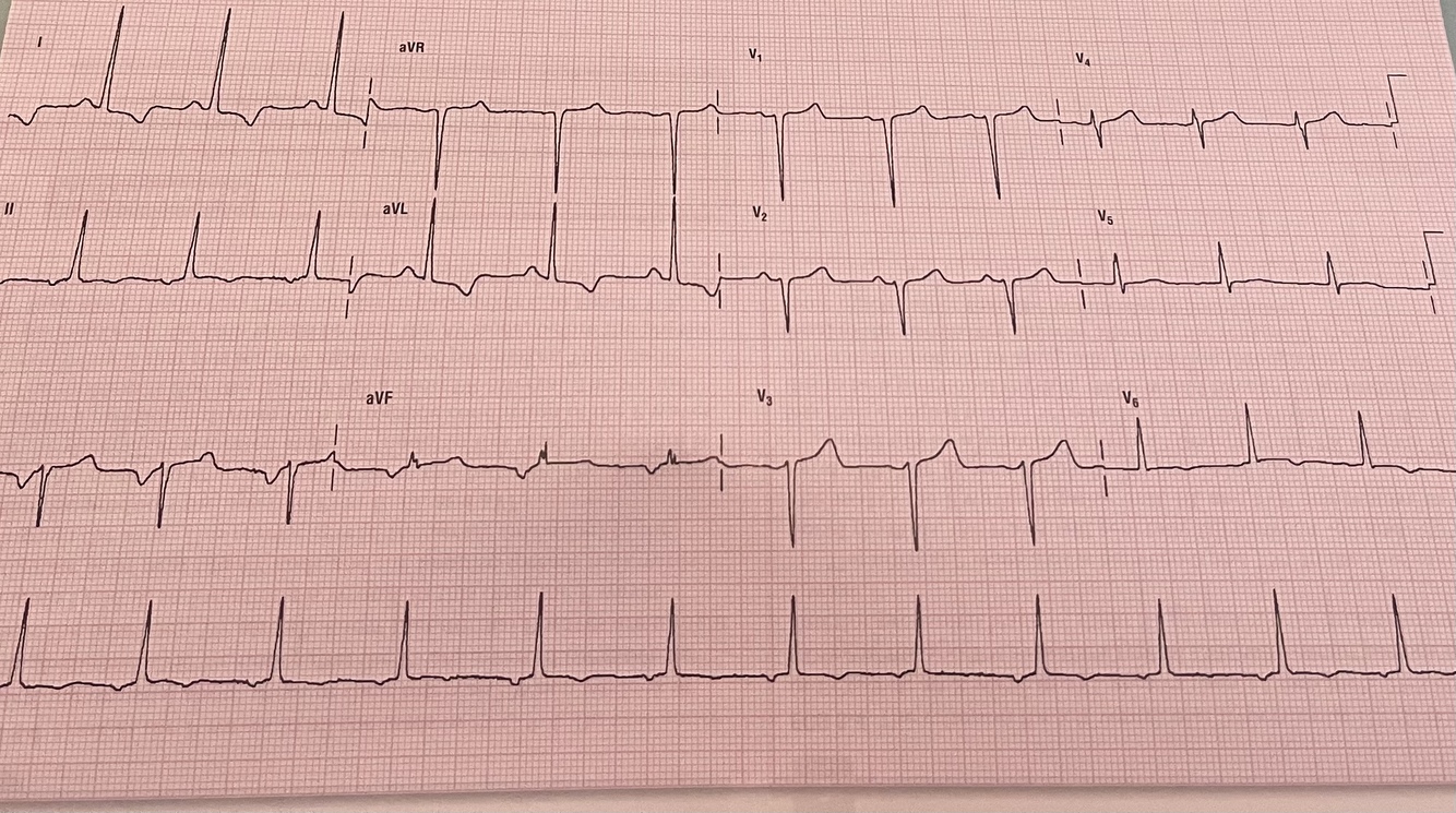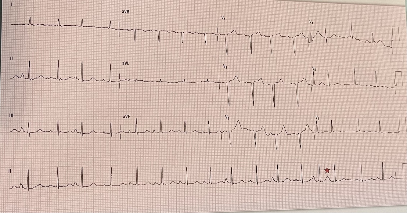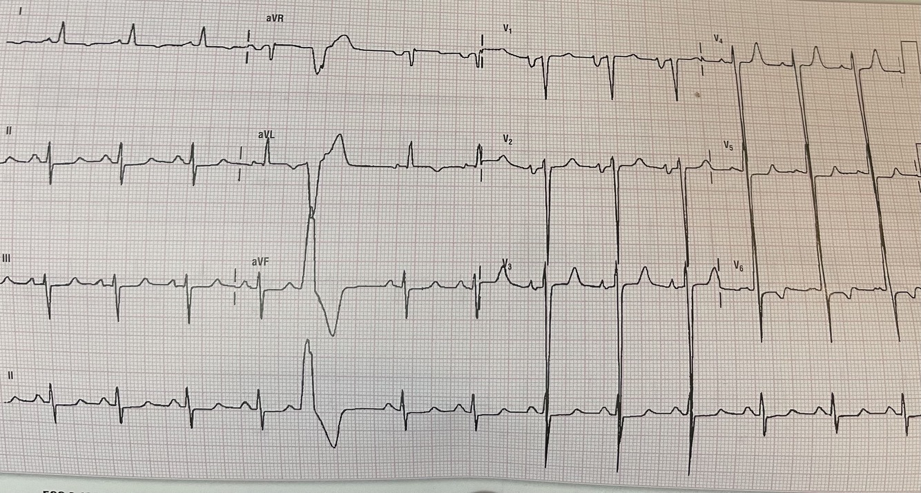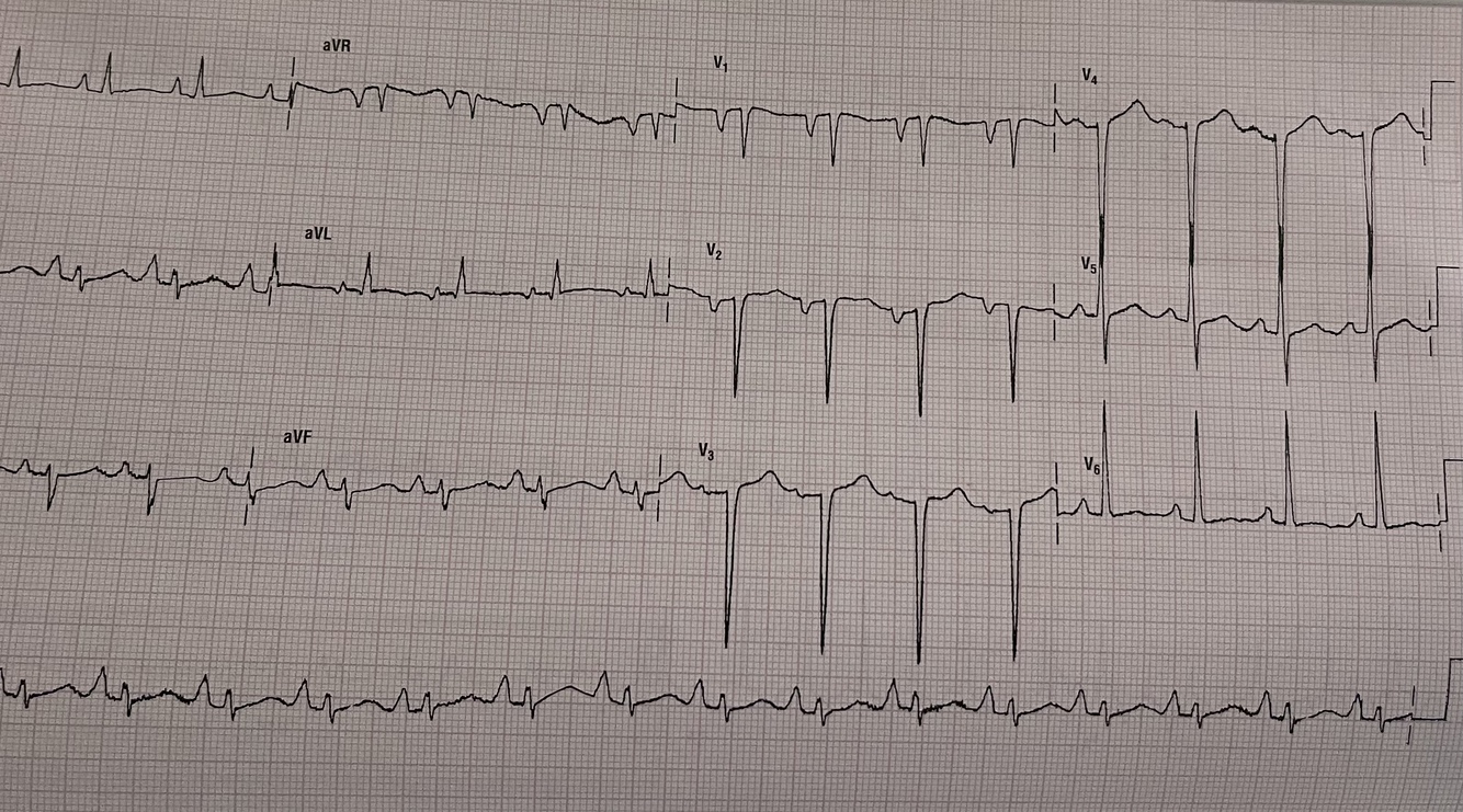 In this EKG we see P-mitrale in leads II and III indicative of LAE. We also see deep S waves in V1-V2 with ST-elevations which could be due to LVH. However, we don’t see increased voltages in lateral leads and this could be due to a prior infarct, left sided pleural effusion or obesity.