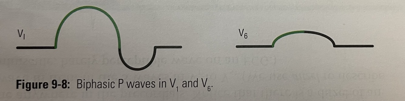 The biphasic p-waves in V1 are width (0.7 sec) x depth (1 mm) which is 0.7 well above 0.3 therefore giving LAE.
