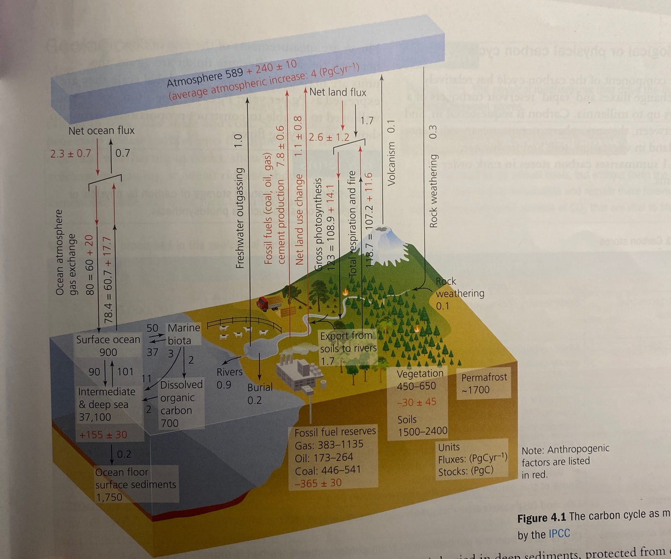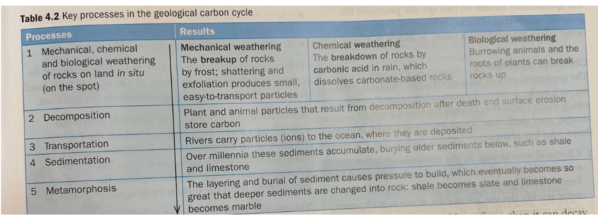 Most of the Earth’s carbon is geological, resulting from the formation of sedimentary carbonate rocks (limestone) in the oceans, and biologically derived carbon in rocks like shale and coal. Slow geological processes release carbon into the atmosphere through chemical weathering of rocks, shown in Table 4.2, and volcanic outgassing at ocean ridges/subduction zones.