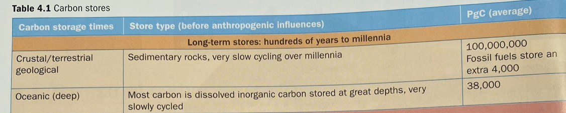 Limestone, shale and fossil fuels are important carbon stores.