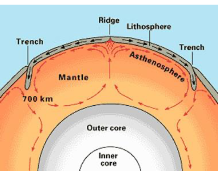 These hot, liquid magma currents are thought to move in circles in the asthenosphere – thus causing the plates to move.