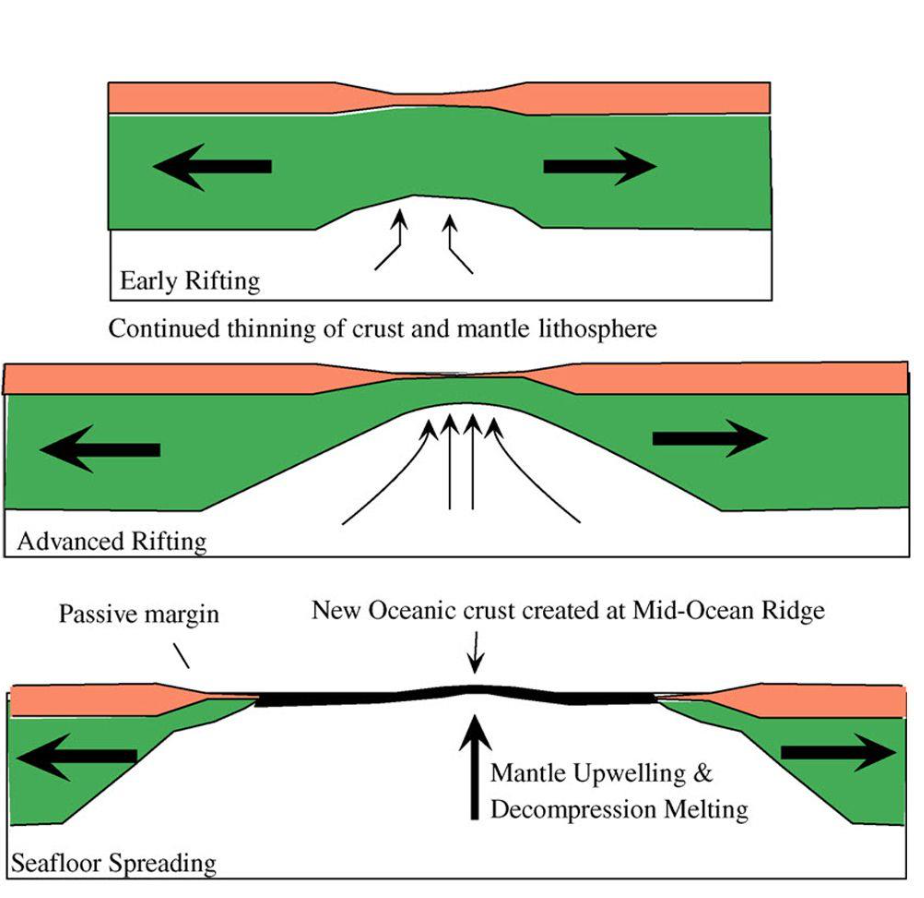 In the middle of many oceans there are mid-ocean ridges, or underwater mountain ranges. These are formed when hot magma (molten rock) is forced up from the asthenosphere and hardens – forming new oceanic crust.