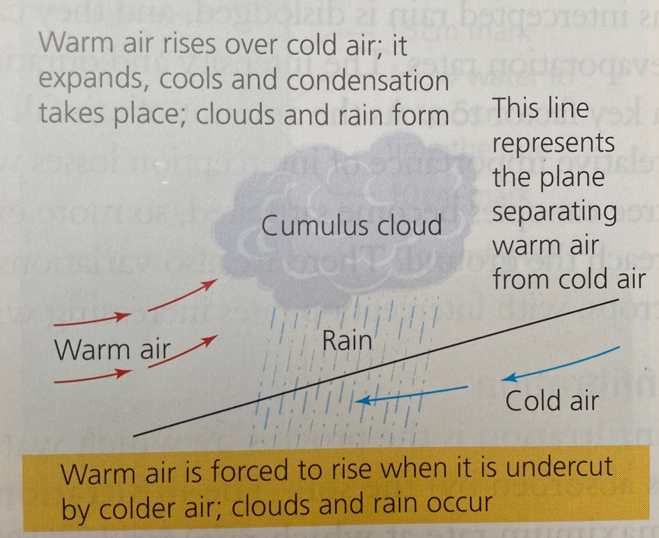 This happens when warm air, which is lighter and less dense, is forced to rise over cold, denser air. As it rises, the air cools and its ability to hold water vapour decreases. Condensation occurs and clouds and rain form.