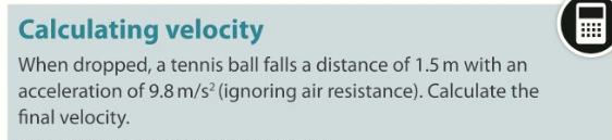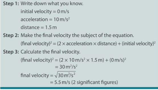 use the suvat equation (final velocity squared = initial velocity squared = 2 X acceleration X distance