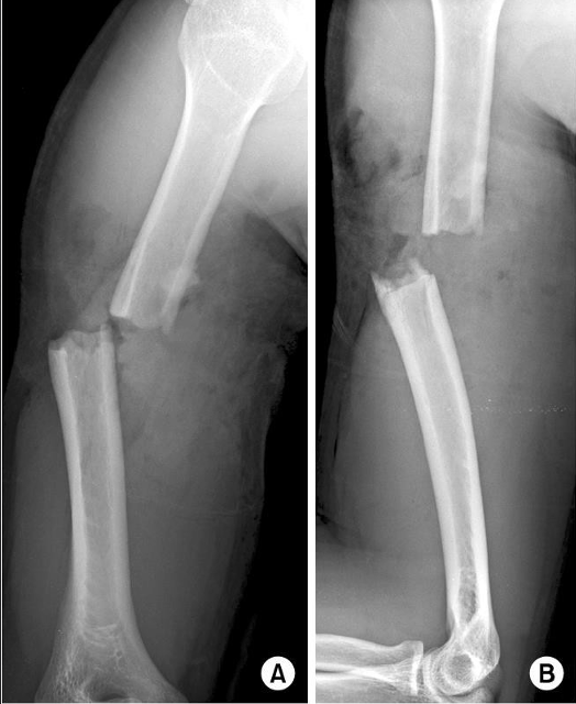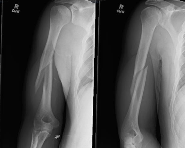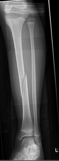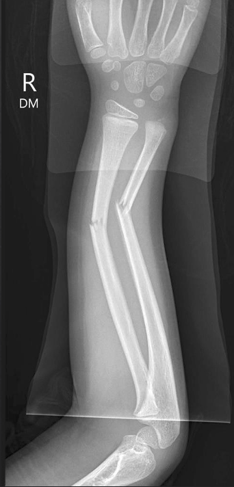 Greenstick fracture of the radial mid-diaphysis and a complete transverse fracture of the mid-diaphysis of the ulna, both associated with angulation