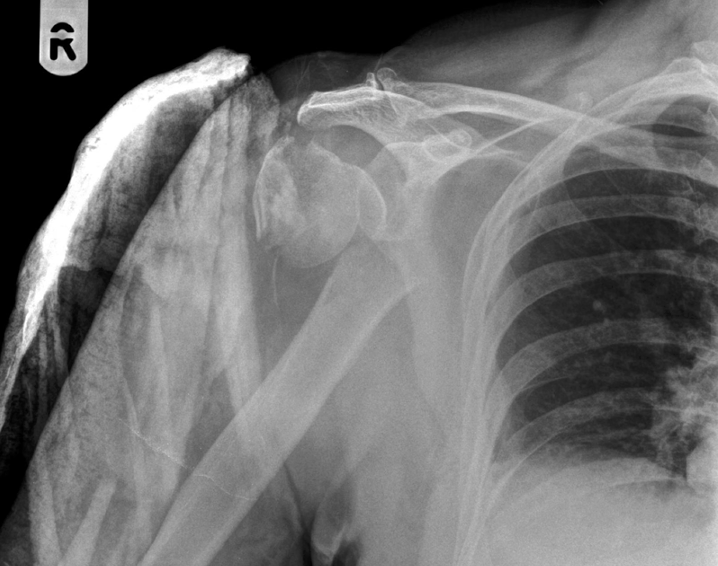 Comminuted fracture of proximal humeral metaphysis with shortening and dislocation of the shoulder joint