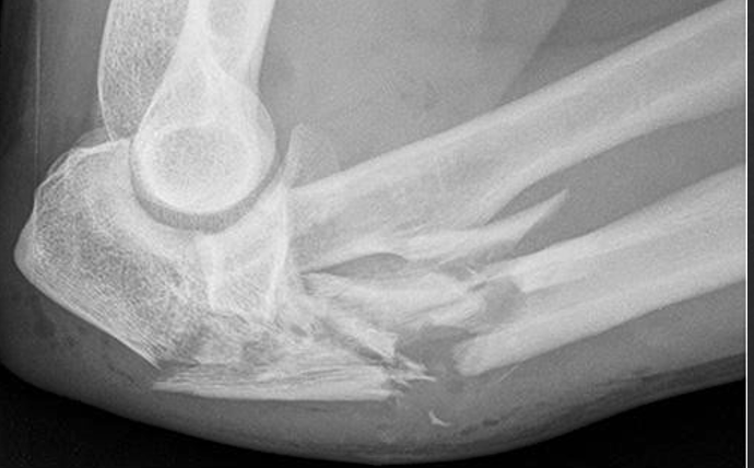 Left elbow. Open intra-articular comminuted fracture of the proximal radius and ulna, with air in the soft tissues