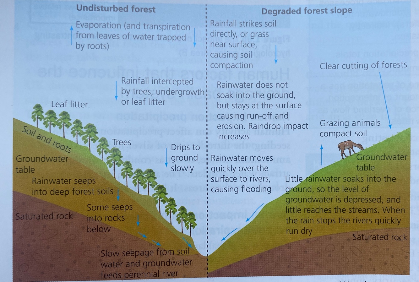 Human impacts on infiltration largely result from a change in land use. Infiltration is up to five times greater under forests when compared with grassland. With conversion to farmland there is reduced interception, increased soil compaction and more overland flow. This impact is summarised in Figure 1.11. Land-use practices are also important: while grazing cows leads to soil compaction by the trampling of animals, ploughing increases infiltration by loosening and aerating the soil. Waterlogging and salinisation are common if there is poor drainage, so installing drainage mitigates these problems.