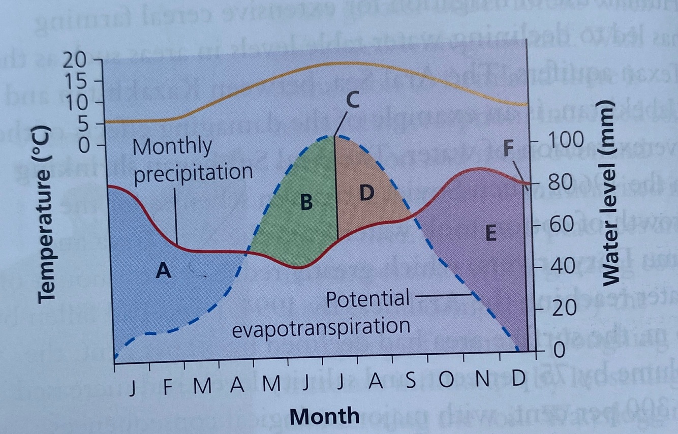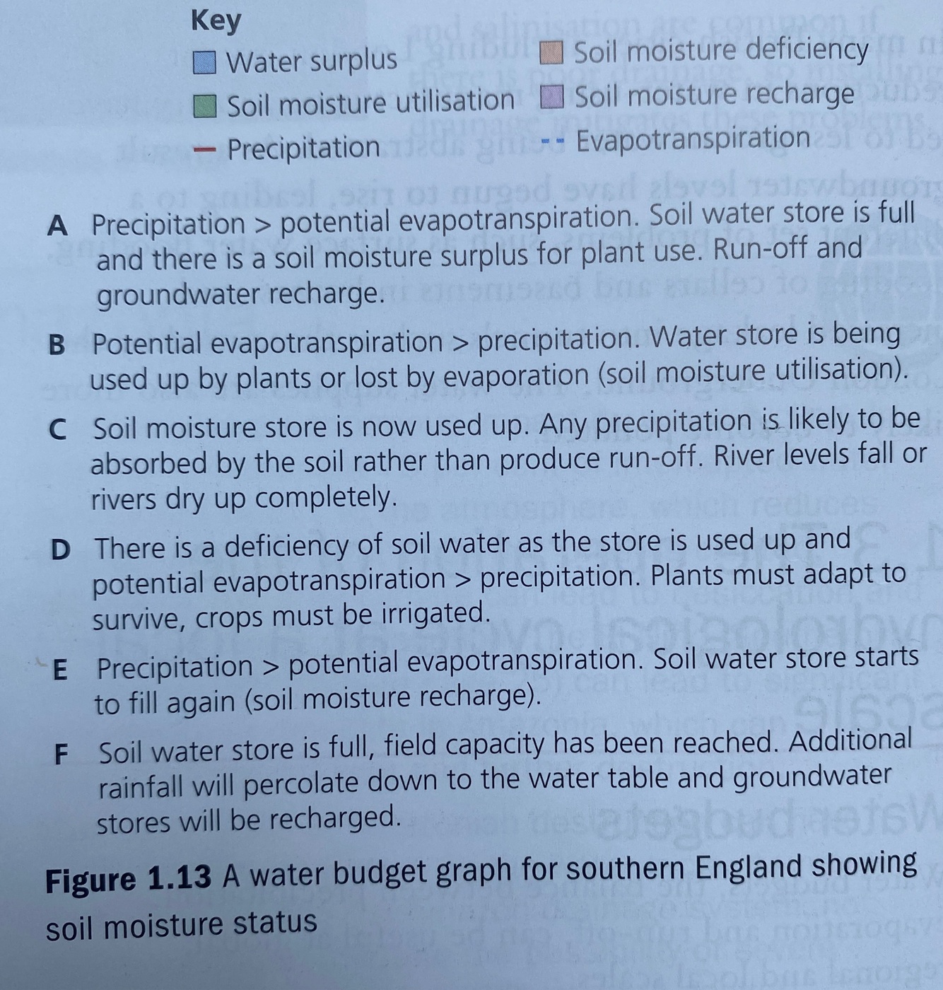 Figure 1.13 shows a water budget for southern England. In the UK, the annual precipitation exceeds evaporation in most years and in most places. Therefore, precipitation inputs exceed evaporation losses, so there will be a positive water balance. However, in some years of drought (for example, 1975-6 and 1995-6), and in some summer months, England has a temporary negative water balance.