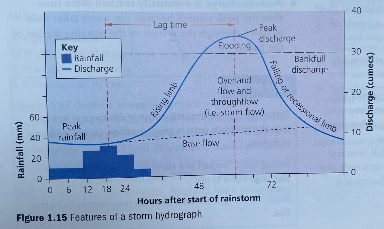 • Once the rainfall input begins the discharge starts to rise; this is shown on the rising limb.