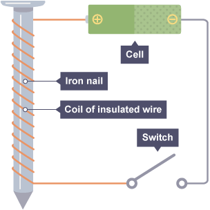 An electromagnet consists of a coil of insulated wire wrapped around an iron core.