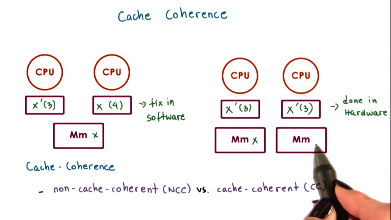 On non-cache-coherent architecture, when a CPU performs a write and its cache’s value is updated, the hardware won’t do anything to make sure this value is also updated in other CPUs caches.