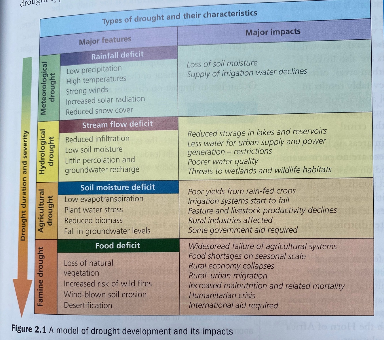Although the fundamental definition is a ‘shortfall’ or deficiency of water over an extended time period, usually at least a season, there are a wide variety of drought types, as shown in Figure 2.1.