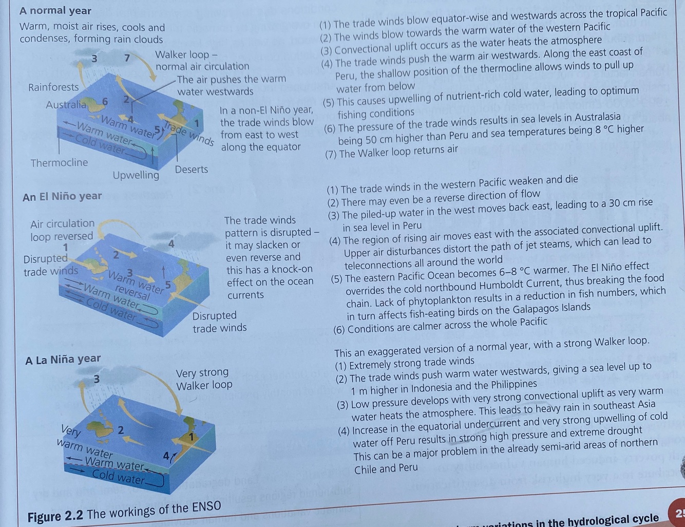 Figure 2.2 shows normal conditions in the Pacific basin, and then conditions during an El Niño event when the cool water normally found along the coast of Peru is replaced by warmer water. At the same time the area of warmer water further west, near Australia and Indonesia, is replaced by cooler water. La Niña is preceded by a build-up of cooler-than-normal subsurface water in the tropical Pacific - an extreme case of the normal situation. El Niño events usually occur every three to seven years and usually last for 18 months. A La Niña episode may, but does not always, follow an El Niño event. In terms of drought occurrence, El Niño can trigger very dry conditions throughout the world, usually in its second year, especially in South East Asia, India, eastern Australia, south-eastern USA, Central America and north-eastern Brazil, as well as further afield in parts of Africa (Kenya and Ethiopia). In India, El Niño years always lead to relatively weak monsoon rains, exacerbating drought by monsoon failure. La Niña can also lead to severe drought conditions, but these are usually localised on the western coasts of South America. Cooler than normal ocean temperatures can generate anticyclonic weather and, therefore, very dry conditions associated with descending air.