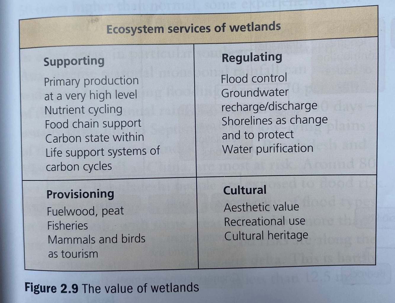• All these functions contribute towards their value for human society, as providers of resources (fish, fuelwood, etc.), of services in terms of hydrology within the water cycle, and as carbon stores (peat) within the carbon cycle. Figure 2.9 summarises their value.