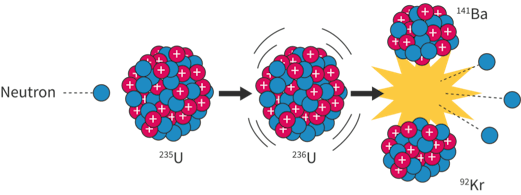 Uranium-235 becomes uranium-236 when neutron is fired at it. The heavier isotope is unstable and it splits into krypton, barium & 3 neutrons. (235,92) U + (1,0) n -> (236,92) U -> (92,36) K + (141,56) Ba + 3 (1,0) n