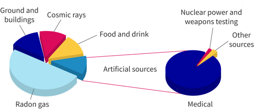 Low, not harmful levels of radiation always present in the environment. Mainly comes from radon gas, radioactive rocks & buildings (produce radon gas), food & drink (contain/absorb mildly radioactive nutrients/minerals), and cosmic rays. Artificial sources also include medical procedures and nuclear accidents/testing on nuclear weapons.