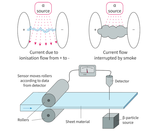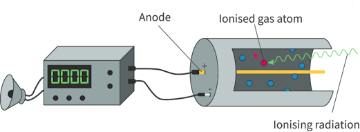 A Geiger–Müller (GM) tube detects alpha, beta and gamma radiation. A ‘click’ can be heard as the radiation is detected and a digital count is recorded. Can be used to measure rate of radioactive decay by count rate (number of emissions of radiation in certain time). Usually count/s but can be count/min