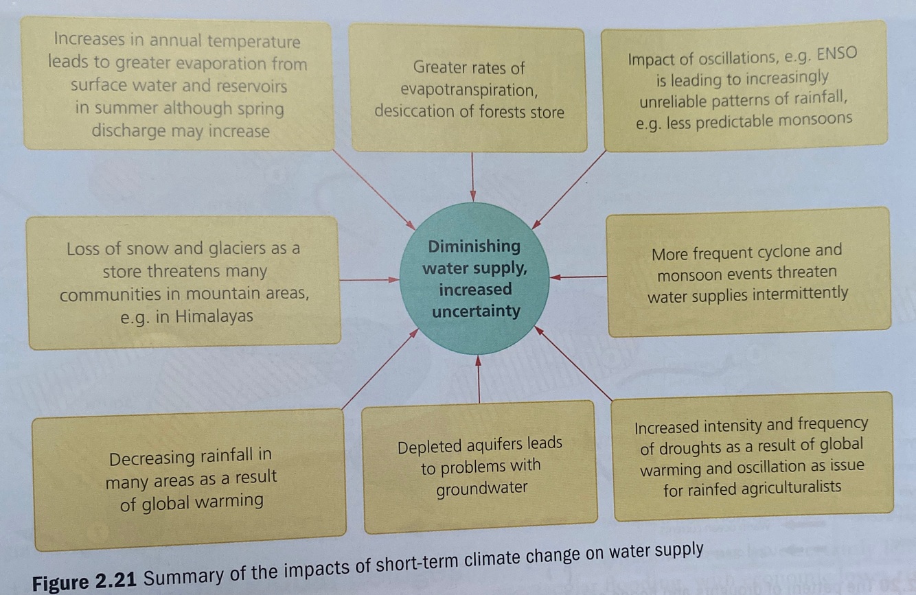 As the impacts of climate change vary around the world, with differential amounts of temperature increase and varying changes to totals and distribution of rainfall, there will be differential changes in the way the hydrological cycle (open system operates within the world’s drainage basins. There will be different impacts on drainage basins in different climate zones of the world, for example, caused by differential precipitation and run-off predictions. Therefore, decision makers in various countries will have to cope with changes in water budgets, and this will impact on the way climate change is managed to secure water resources for the future.
