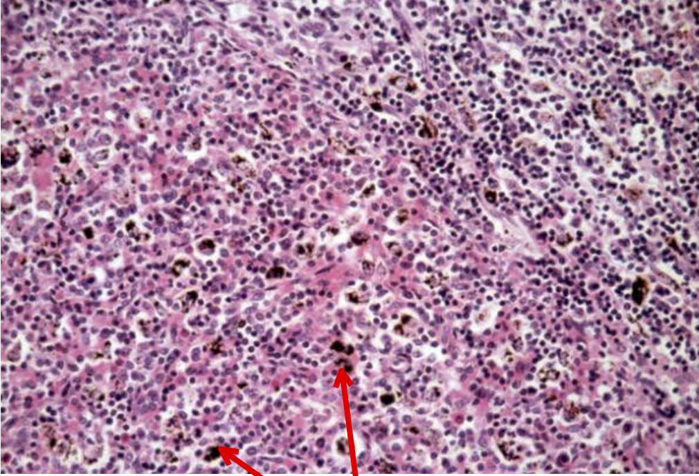 Malarial spleen: low power photomicrograph , identify what is pointed at by the arrow