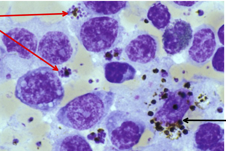 the image is showing smear preparation of the spleen , identify what is pointed at with the red arrow