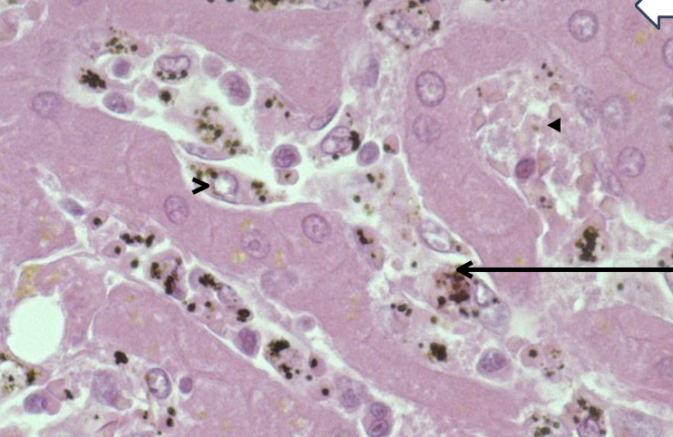 Microscopic image of liver infected with malaria , identify what is pointed at by the black arrow
