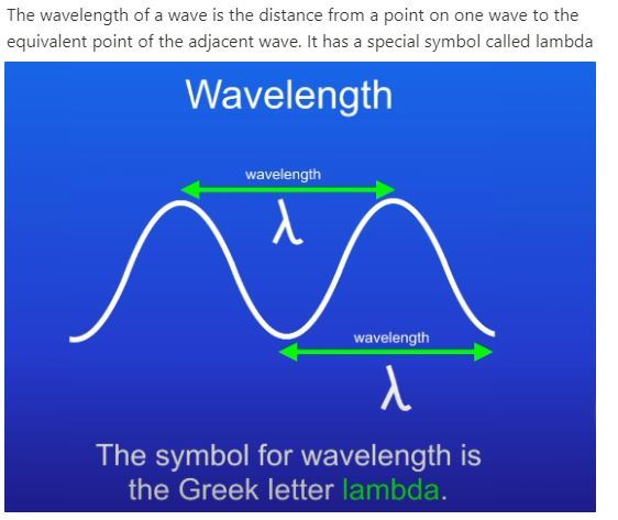 Wavelength distance covered by a full cycle of the wave, usually measured from peak to peak, or trough to trough