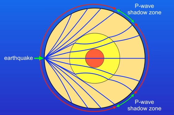 Refractions between layers cause two shadow zones, where no P-waves are detected, this suggests The inner core is solid – this is due the fact that P waves travel faster in solids than liquid so they slow down when the enter the liquid outer core causing them to refract which confirms the outer core is liquid.