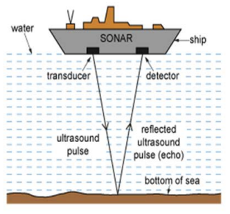 This diagram shows how a shipβs SONAR can be used to measure the depth of the sea. SONAR can also be